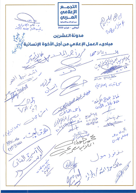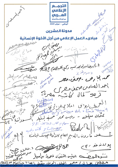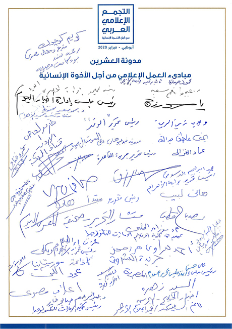 أثمــرت ورش العمــل الخمســة التــي أقيمــت ضمــن فعاليــات التجمــع الإعلامــي العربــي، والتــي تمحــورت حــول عــدد مــن المواضيــع وركــزت بشــكل خــاص علــى الجوانــب الإنســانية للإعــلام وأهميــة اتبــاع أعلــى المعاييــر المهنيــة، عــن توقيــع ميثــاق أخلاقــي للعمــل الإعلامــي مــن أجــل الأخــوة الإنســانية، أعلــن عنــه الدكتــور ســلطان فيصل الرميثــي، الأميــن العــام لمجلــس حكمــاء المســلمين خــلال الجلســة النهائيــة للفعاليــة.